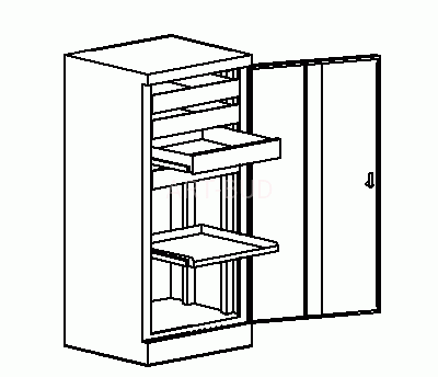 Cztery szuflady i półka wysuwane na prowadnicach rolkowych.