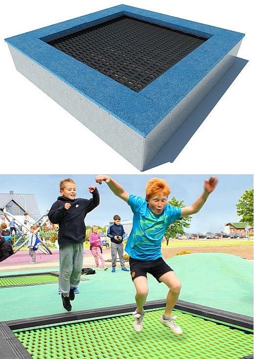 Trampoliny na place zabaw montowane na poziomie ziemi i wykonane wraz z otoczeniem z bezpiecznych tworzyw amortyzujących, są bardzo popularnym uzupełnieniem wszelkich placów zabaw dla dzieci. Trampoliny 1 MOVE są stworzone do użytkowania na dworze w miejscach publicznych. Szczególnie polecane są na place zabaw, dla szkół, przedszkoli i obiektów sportowych. Oferujemy dwa typy trampolin: trampoliny pojedyncze i trampoliny systemowe. Trampolina pojedyncza to urządzenie gotowe do zainstalowania w ziemi.