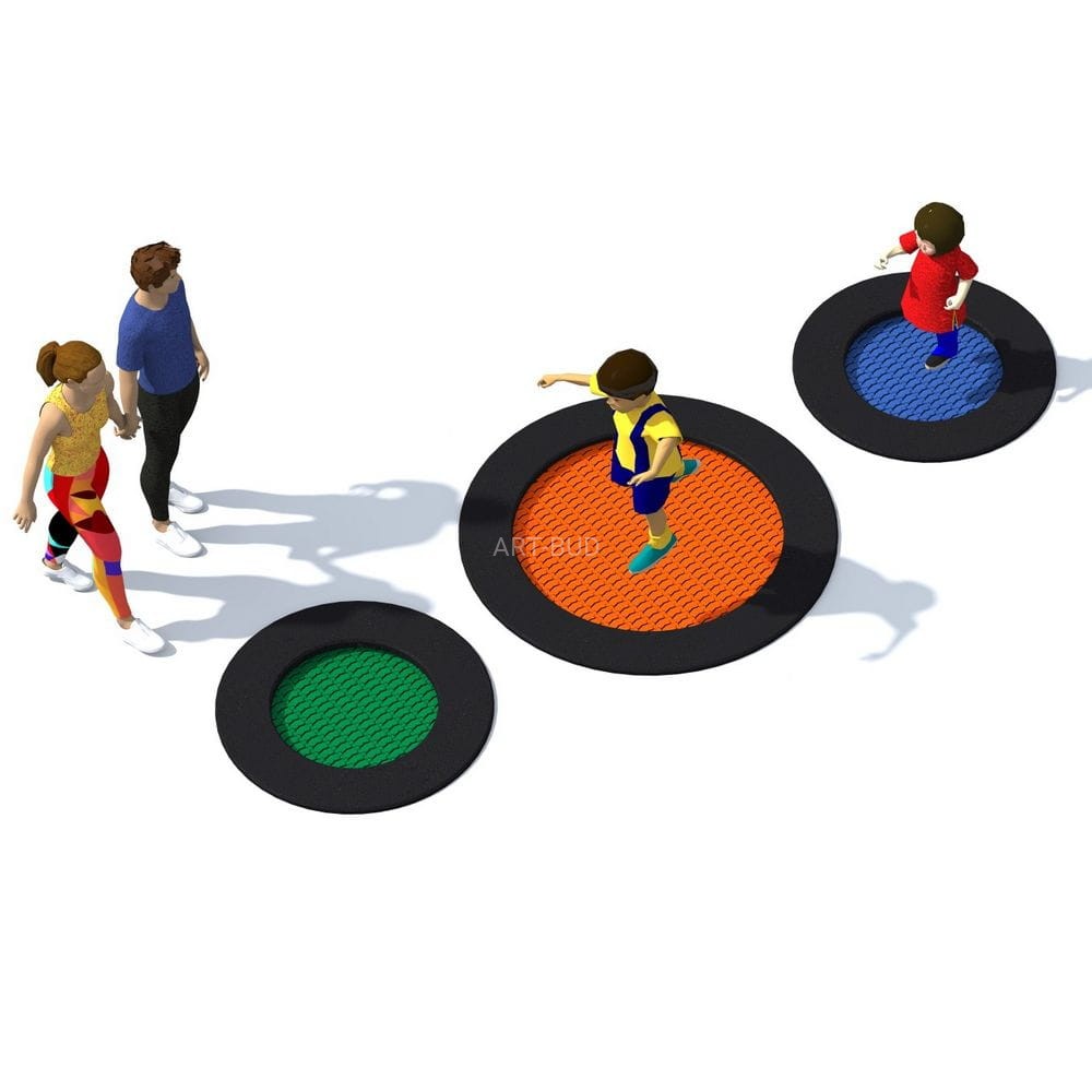 Zestaw 3 trampolin okrągłych ( 2 sztuki Rado 125 i 1 sztuka Rado 175) przeznaczony do stosowania na placach zabaw o intensywnym użytkowaniu. Mata do skakania wykonana jest z bardzo wytrzymałych lamelek Hercules o szerokości min. 37 mm, posiadających kształt litery „V” oraz wzmacniającą kratownicę. Dzięki unikalnemu kształtowi lamelek zmniejszone zostały do zaledwie 7 mm przestrzenie pomiędzy elementami maty co zapobiega wpadnięciu do wnętrza trampoliny drobnych przedmiotów jak np. klucze czy telefony komórkowe. Mata dostępna jest w 8 kolorach, istnieje także możliwość wykonania grafiki na macie. Gumowy kołnierz trampoliny występuje w 2 kolorach standardowych i 23 kolorach specjalnych. Na kołnierzu można dodatkowo wykonać dekoracyjny wzór. Trampolina może być wyposażona w podnoszoną pokrywę, która ułatwia czyszczenie jej wnętrza.