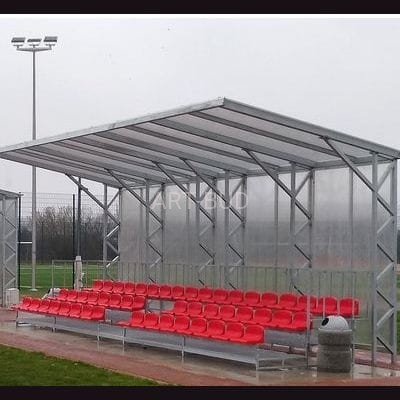 65. Trybuna sportowa zadaszona 50 miejsc, 3 rzędy długość 9 m, szerokość 2,3 m jedno wejście 1 m siedziska o wysokości 25 cm dach o wymiarach 9 m x 3 m ściana tylna o wymiarach 9 m x 3 m pokrycie z poliwęglanu komorowego |