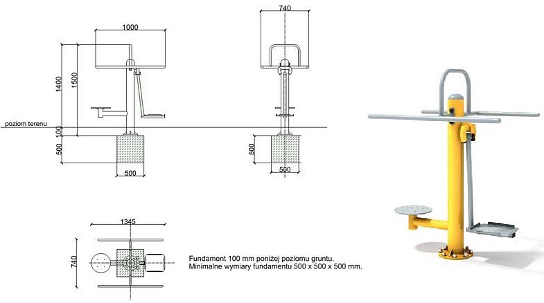 Montaż: mocowanie do fundamentu betonowych (wylewanych na miejscu), osadzonych 10 cm poniżej poziomu terenu. Daje to możliwość zastosowania pod urządzeniami różnego rodzaju nawierzchni np. trawiastej, różnego rodzaju nawierzchni bezpiecznej, z kostki brukowej itp.