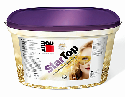 Najnowszej generacji, gotowy do użycia, barwiony w masie, cienkowarstwowy tynk strukturalny na bazie żywicy silikonowej. Łatwy w użyciu, elastyczny i paro przepuszczalny. Posiada nowoczesny wypełniacz funkcjonalny pozwalający w kontakcie z deszczem, mgłą i skroploną wodą uzyskać szybkoschnącą powierzchnię elewacji. Wysoce odporny na niekorzystne warunki pogodowe i zabrudzenia. Do stosowania w systemach ociepleń. Produkt posiada zwiększoną ochronę przed grzybami, glonami i pleśnią. Baumit StarTop to tynk dla elewacji szczególnie narażonych na zabrudzenia i korozję mikrobiologiczną. Baumit opracował silikonowy tynk wyposażony w innowacyjny wypełniacz, który niczym koralowiec (mający tysiące maleńkich porów) dysponuje nadzwyczaj dużą powierzchnią. Ta ekstremalnie drobna mikrostruktura wywołuje efekt „drypor”. Właściwości hydrofobowe oraz porowata struktura tynku powodują spływanie kropel wody, dzięki czemu po deszczu powierzchnia elewacji wysycha szybciej. Pozostała wilgoć dzięki właściwościom hydrofilowym rozprzestrzenia się na powierzchni elewacji, co ułatwia jej odparowanie. Połączenie tych dwóch funkcji – szybkiego wysychania oraz skraplania się wody – sprawia, że powierzchnia elewacji jest niemalże całkowicie odporna na zabrudzenia i skutecznie chroniona przed algami czy grzybami. Warto podkreślić także zintensyfikowanie odcienia bieli z 71% do 75% oraz kompatybilność ze wszystkimi pigmentami do tynków i farb, zarówno organicznymi, jak i nieorganicznymi. Tynk dostępny w kolorach Life.