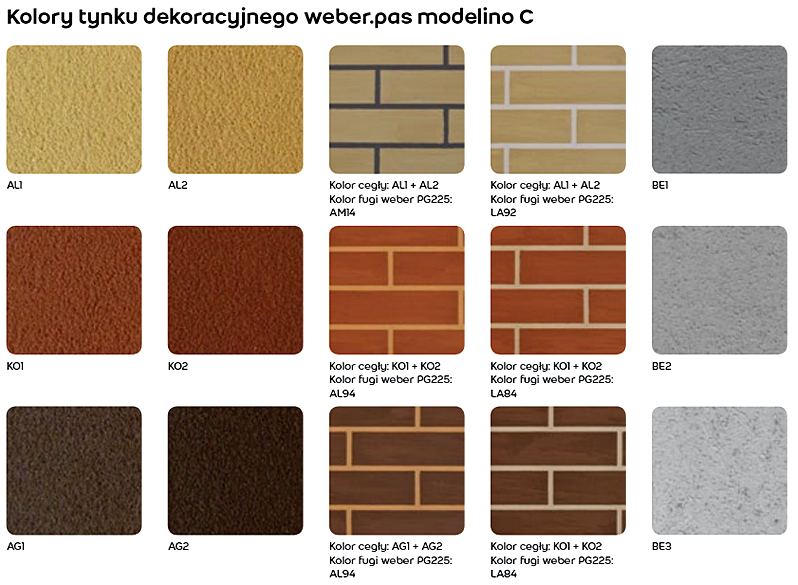 Masa tynkarska weber.pas modelino C występuje w gamie 6 kolorów, możliwe opracowanie dowolnych kolorów na życzenie. Tynki dekoracyjne Weber są produkowane na bazie naturalnego kruszywa marmurowego, które może mieć różny odcień w zależności od złoża. W związku z tym przy aplikacji tynków dekoracyjnych należy pamiętać, że pełne, niepodzielne powierzchnie ściany powinny być tynkowane w całości, bez przerw w pracy z tej samej partii produkcyjnej (ten sam numer serii na opakowaniu). Prace tynkarskie należy zorganizować w odpowiedni sposób, w zależności od wielkości tynkowanej powierzchni i warunków atmosferycznych. Podczas dobierania kolorów należy szczególnie pamiętać o tym, że uzyskują one inną barwę w świetle naturalnym a inną w sztucznym. Różnice wynikają także z odmienności postrzegania barwy na papierze i na elewacji. Ponadto na kolorystyczne wrażenia mają wpływ: zróżnicowane faktury powierzchni tynków, wilgotność powietrza, pora roku, otoczenie, odległość od obiektu oraz rodzaj i charakter oświetlenia. Ostateczny uzyskany kolor w dużym stopniu zależy również od warunków wykonania.