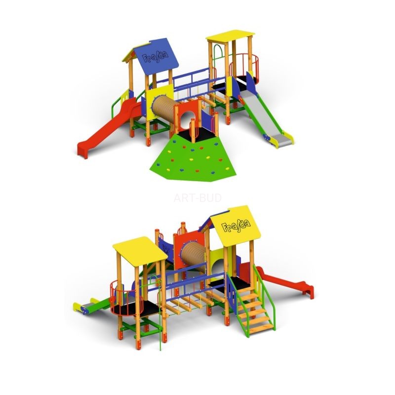 Efektowny zestaw zabawowy na plac zabaw, składający się z drabinki, wieży i zjeżdżalni. Elementy nośne zestawu wykonane z drewna sosnowego, toczonego cylindrycznie bezrdzeniowego. W opcji także z drewna klejonego wzdłużnie lub metalu zabezpieczonego antykorozyjnie i malowanego proszkowo. Drewno jest impregnowane co zabezpiecza je przed wpływem szkodliwych warunków atmosferycznych. Ślizgawki wykonane z laminatu i metalu spełniają wymogi normy PN-EN 1176:2017-12. Dachy, bariery ochronne wykonane ze sklejki drewna liściastego, wodoodpornej, pokrytej filmem melaminowym lub z płyty HDPE odpornej na warunki atmosferyczne. Trapy wykonane ze sklejki drewna liściastego, wodoodpornej, antypoślizgowej, lub z płyty HDPE antypoślizgowej. Elementy mocowań wykonane ze stali węglowej konstrukcyjnej są malowane proszkowo lub ocynkowane. Wszystkie połączenia śrubowe wykonane z użyciem elementów ocynkowanych, a ich końce zabezpieczone plastikowymi kapslami, poprawiającymi bezpieczeństwo.