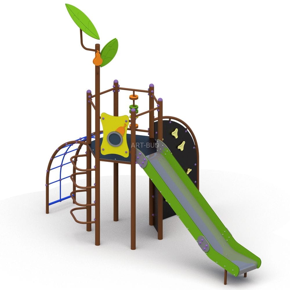 Urządzenie na plac zabaw z płyty HDPE na konstrukcji stalowej, przeznaczona do mocowania w gruncie przez fundamentowanie.