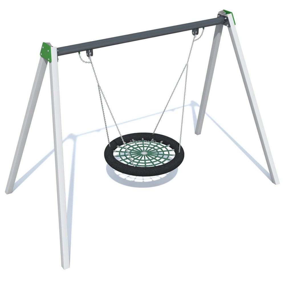 Huśtawka wahadłowa z siedziskiem typu bocianie gniazdo. Konstrukcja wykonana ze stali ocynkowanej, malowanej proszkowo. Kolor konstrukcji RAL 9006, górna belka w kolorze RAL 7016. Siedzisko typu bocianie gniazdo jest dostarczane w różnych kolorach w zależności od dostępności.