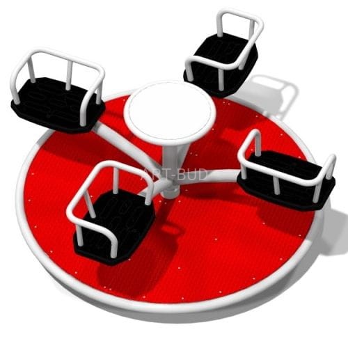 Zabawka typu karuzela tarczowa 4-ramienna z kierownicą napędową. Średnica wynosi 1,58 m. Podłoga karuzeli jest wykonana z płyty PE dzięki czemu jest miękka (bezpieczna), antypoślizgowa (dodatkowa antypoślizgowa faktura) oraz nie ulega nagrzewaniu na słońcu oraz zmrożeniu zimą.