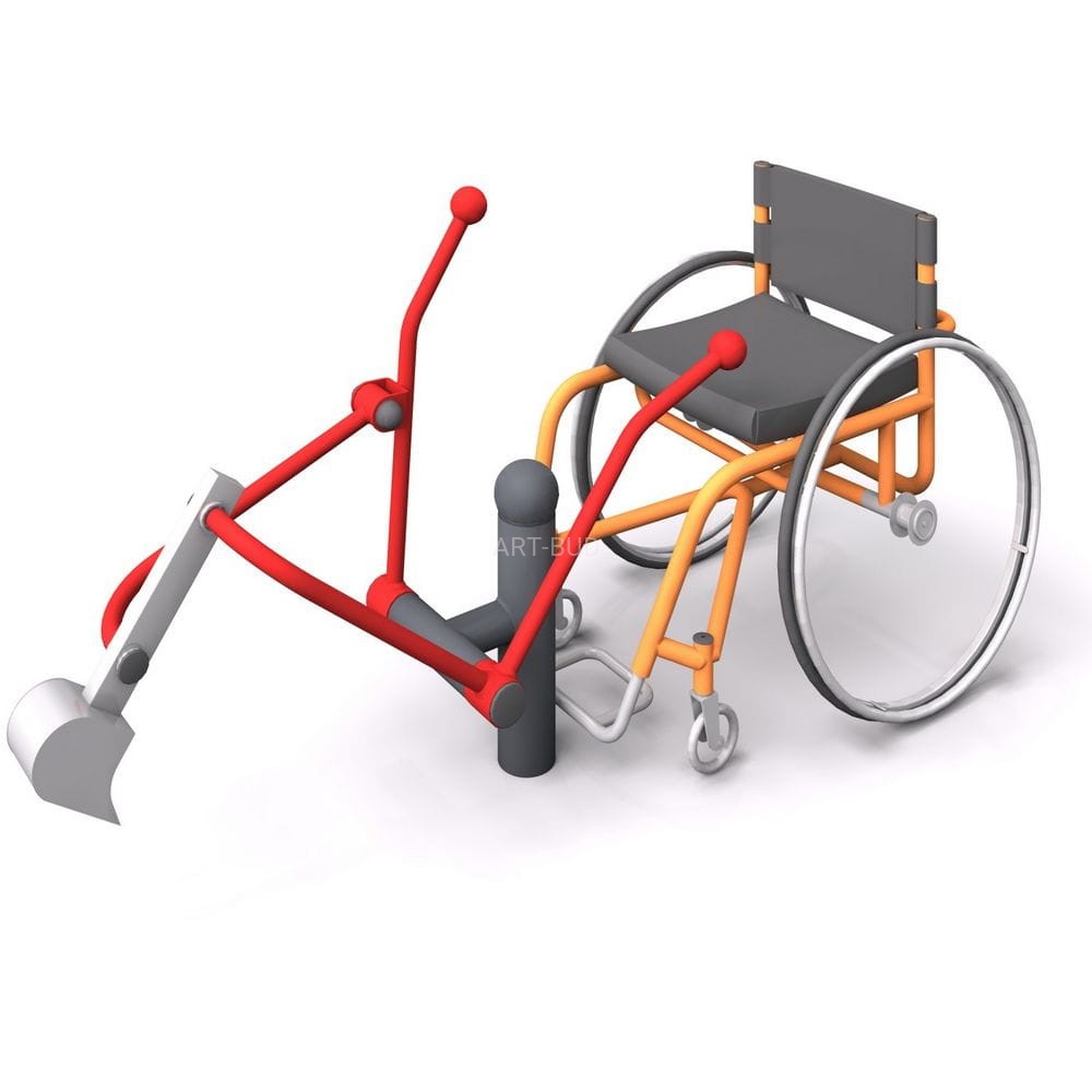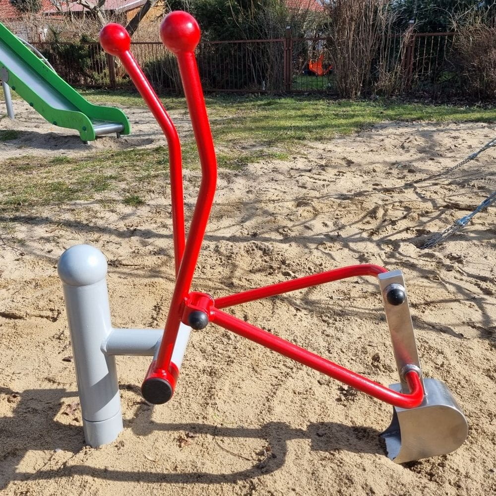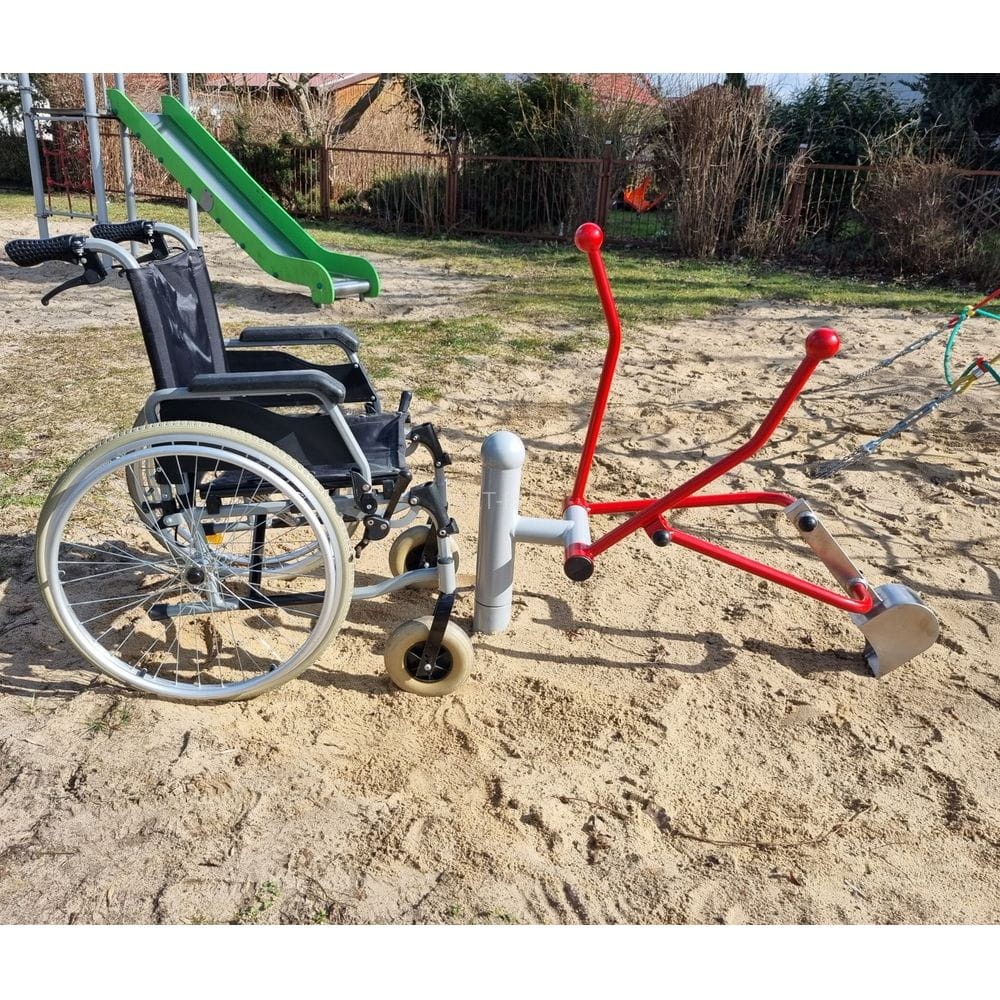 Koparka integracyjna przystosowana do użytkowania przez dzieci poruszające się na wózkach inwalidzkich. Zabawka jest wyjątkową propozycją na place zabaw z piaskownicą lub nawierzchnią z piasku. Produkt jest doskonałym połączeniem świetnej zabawy z aktywnością ruchową dziecka, angażującą i tym samym wzmacniającą jego górne partie ciała. Urządzenie posiada drążki sterownicze do poruszania łyżką koparki zakończone bezpiecznymi, kulistymi elementami. Łyżka koparki wykonana jest ze stali nierdzewnej. Pozostała część konstrukcji koparki składa się ze stali ocynkowanej i malowanej proszkowo.