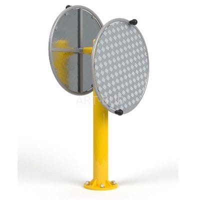 Materiał: urządzenie wykonane z wysokiej jakości stali spawalniczej, dwukrotnie malowane proszkowo farbami epoksydowymi i poliestrowymi. Elementy stalowe zabezpieczone antykorozyjnie poprzez śrutowanie i cynkowanie. Rama koła wypełniona płytą aluminiową, ryflowaną. Śruby osłonięte zaślepkami. Kolorystyka urządzeń dowolna z palety RAL, w standardzie kolor szary (RAL 7004) i żółty (RAL 1018).