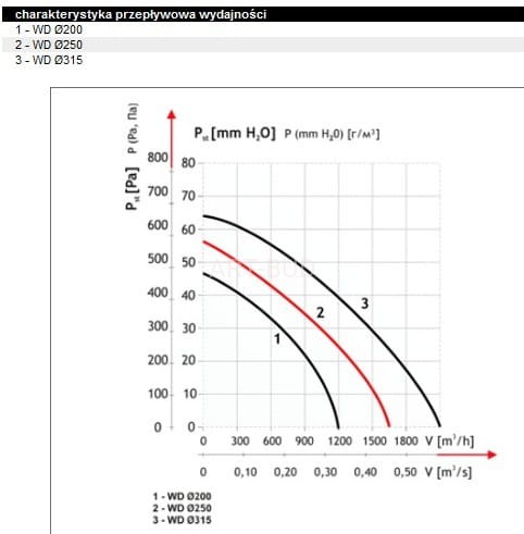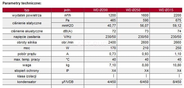 Wentylator WD to promieniowy wentylator dachowy.dostępny jest w trzech rozmiarach: fi 200, fi 250, fi 315.Obudowa wentylatora wykonana jest a blachy ocynkowanej.Wentylator wyposażony jest w silnik na łożyskach kulkowych.W celu zoptymalizowania pracy urządzenia istnieje możliwość zastosowania regulatora obrotów RN 300 lub RP 300