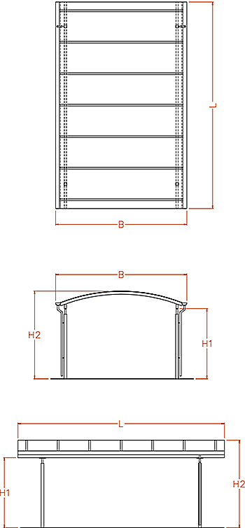 Wiata z dachem półokrągłym dostępna jest jako zadaszenie wolnostojące (na czterech słupkach nośnych) lub jako wiata przyścienna (mocowana z jednej strony do ściany budynku, a z drugiej na dwóch solidnych słupach nośnych).