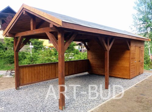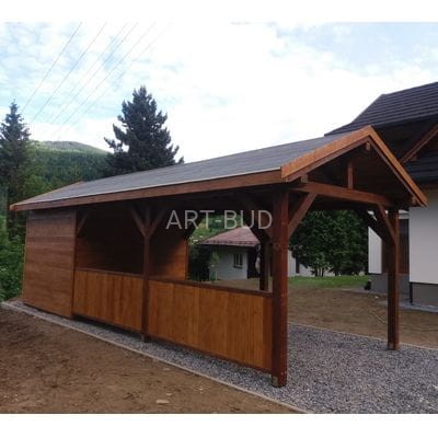 Mastro to stylowa wiata garażowa z pomieszczeniem gospodarczym. Wiata o wymiarach: 300x700 cm - 21 m.kw. (rozstaw słupów) w tym pomieszczenie gospodarcze 300x200 cm - 6 m.kw., wymiar zadaszenia: 350x750 cm- 26,25 m.kw. Konstrukcja w tradycyjnym stylu, dach dwuspadowy. Jeden bok wiaty zabudowany do wysokości 100 cm. Zabudowę boków można dowolnie modyfikować, możliwa również zabudowa szczytu. Całość wykonana solidnie i z dbałością o szczegóły.