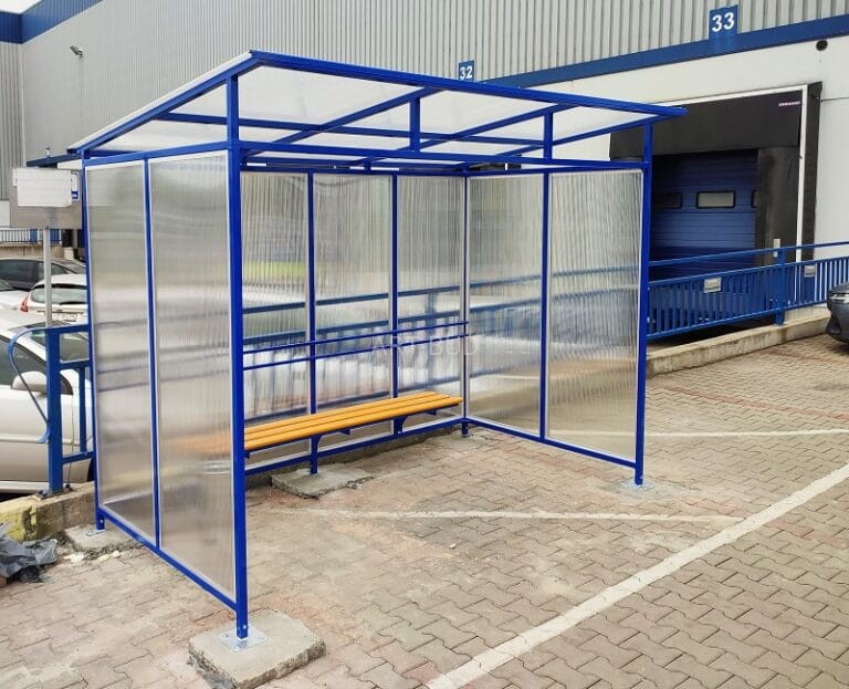 Pokrycie stanowi poliwęglan komorowy o grubości 6-8 mm z filtrem UV lub opcjonalnie szkło hartowane 6 mm.Każda wiata posiada ławeczkę stalowo drewnianą.