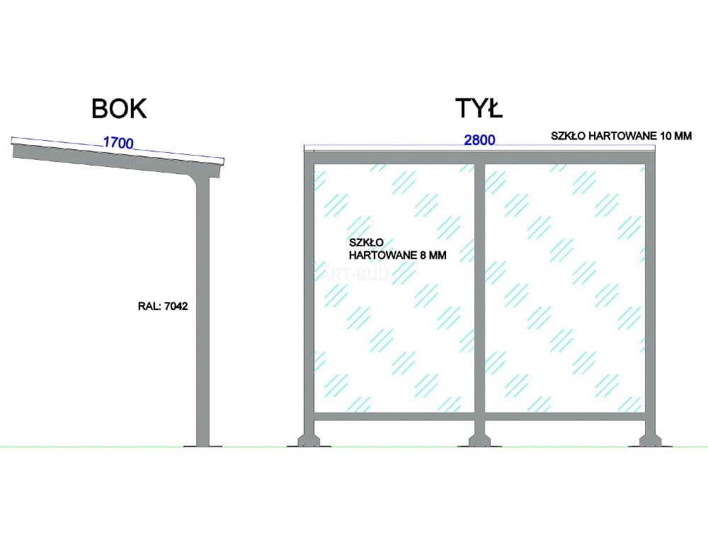 Montaż wyłącznie na płycie betonowej wykonanej przez zamawiającego. Wiata malowana proszkowo w standardzie, front i boki niezabudowane, wyposażona w ławkę, obicie poliwęglan w standardzie lub szkło - na zapytanie