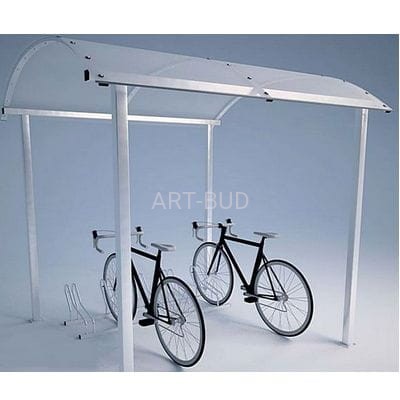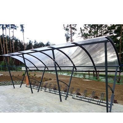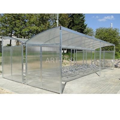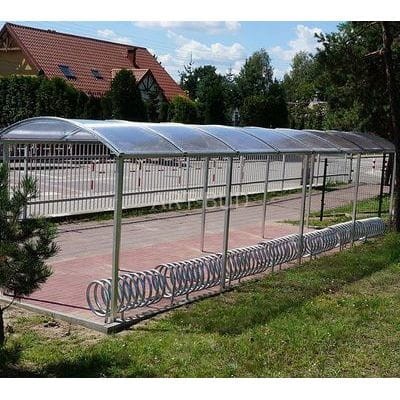 Wiata rowerowa 5 do parkowania rowerów, bardzo wysokiej jakości konstrukcja stalowa zabezpieczona antykorozyjnie, zadaszona płytą z przeźroczystego poliwęglanu komorowego. Główną zaletą wiaty jest możliwość montażu kolejnych modułów zadaszenia, a tym samym zapewnienie ochrony dla większej ilości rowerów.