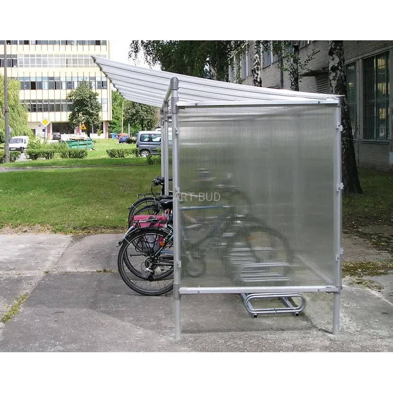 Zadaszenie: płyty z komorowego poliwęglanu 10 mm, zabezpieczone UV – chroni rowery przed deszczem, śniegiem i promieniowaniem słonecznym.