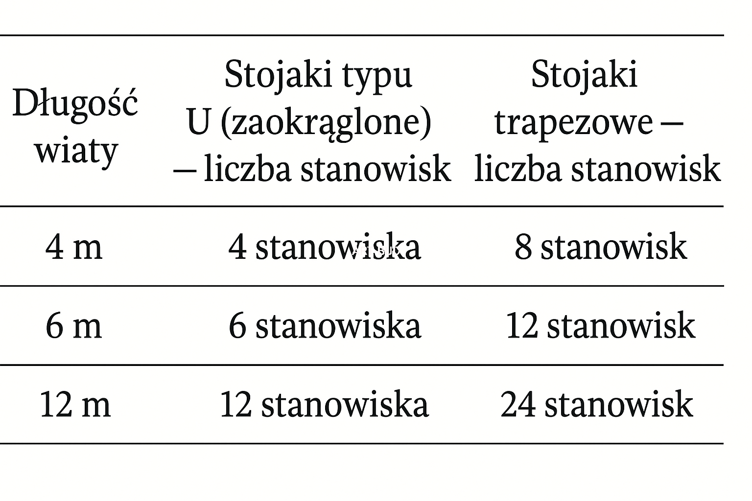 | Długość wiaty | Stojaki typu U (zaokrąglone) — liczba stanowisk | Stojaki trapezowe — liczba stanowisk |