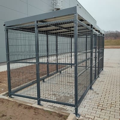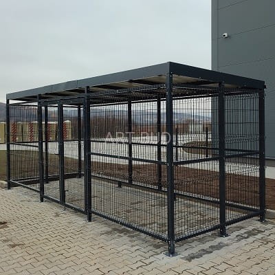 Wymiary: 7×3m, konstrukcja z stali ocynkowanej, dach z blachy trapezowej, ściany z siatki panelowej, furtka 1,2m.