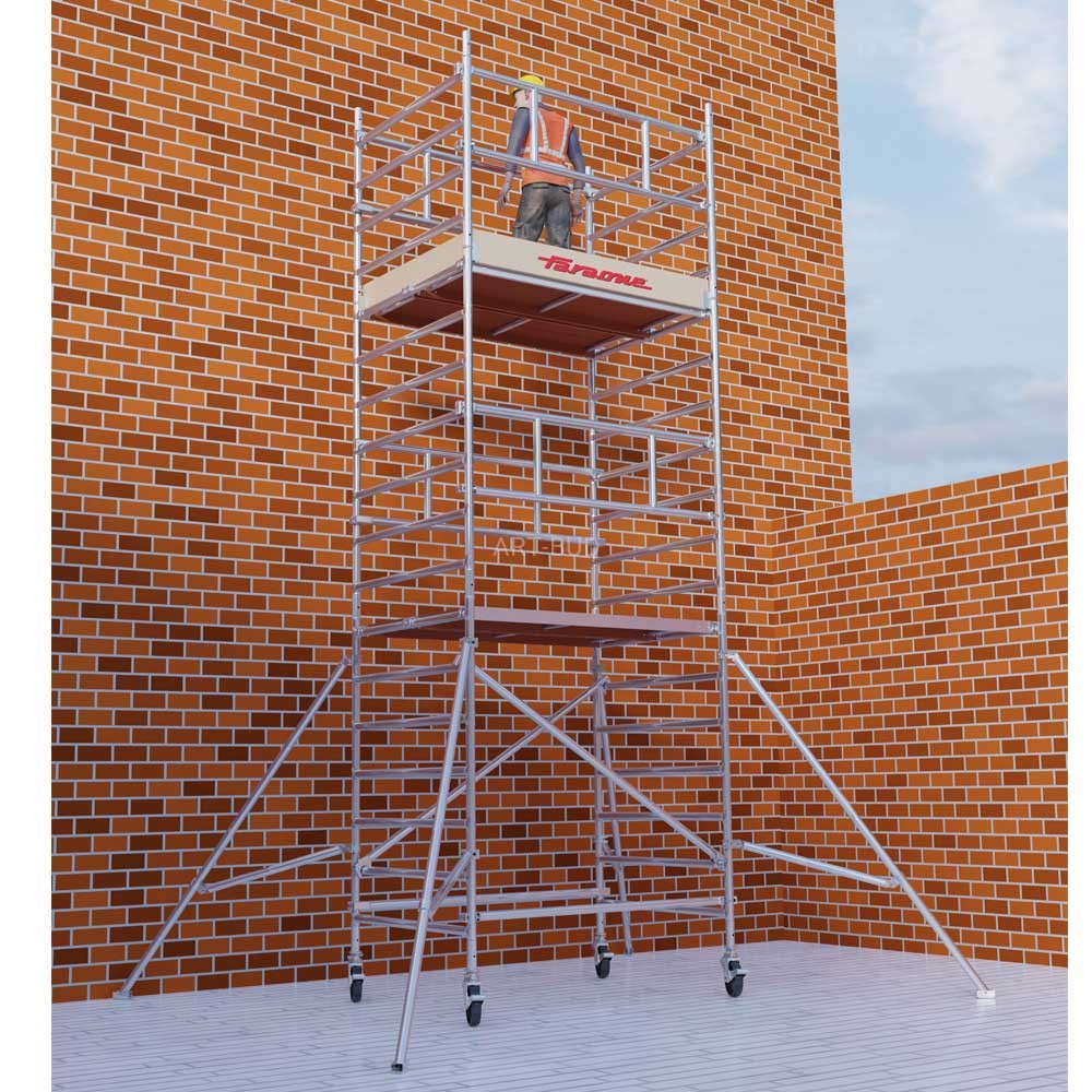 Składa się z lekkich i wygodnych w montażu ram. System Bezpiecznego montażu górnego obszaru roboczego odbywa się z dolnego poziomu w całkowicie bezpieczny sposób. Wieże jezdne Top System Safety Faraone to gwarancja bezpiecznej pracy. Operator pracuje na bardzo bezpiecznym, antypoślizgowym podeście roboczym mocowanym na haki. Podesty zabezpieczone są drewnianymi bortnicami. Łatwe przemieszczanie wież zapewniają wytrzymałe koła o średnicy 200 mm z poliamidu oblanego poliuretanem. Elementy rusztowania są odporne na korozję.