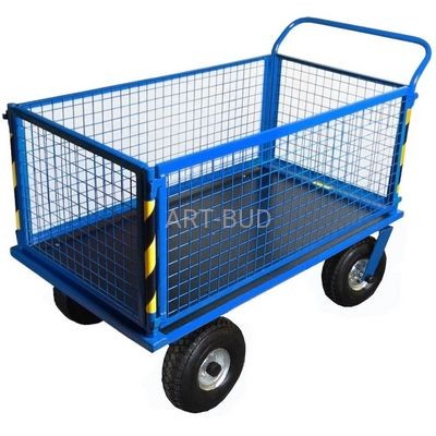 Klasyczny niski wózek magazynowy czterokołowy z podestem o nośności do 400 kg. Podest wzmocniony grubą, odporną płytą wodoodporną o grubości 12 mm, wmontowaną w stalową ramę obwiedniową. Platforma ładunkowa posiada wysokie na 50 cm boki (burty) z ramy stalowej wypełnionej metalową siatką. Konstrukcja taka pozwala na transport dużej ilości małych opakowań jednostkowych, zwłaszcza o kształtach niestandardowych. Z jednej strony wózek zaopatrzony w wygodny, ergonomiczny pałąk sterujący i dwoma kołami skrętnymi dla wygodnego kierowania urządzeniem w czasie transportu towarów.