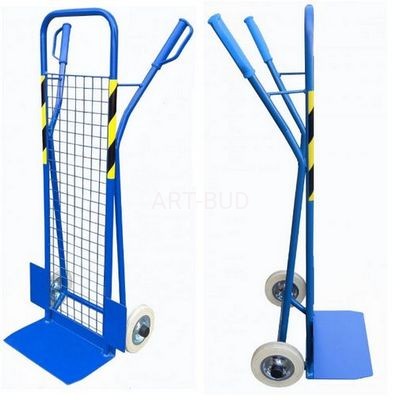 Klasyczny stalowy transportowy wózek magazynowy ze stalową stopką przechylny. Służy do transportu magazynowego ciężkich ładunków i pakunków standaryzowanych o regularnych kształtach i wymiarach. Oferowana konstrukcja jest dodatkowo zabezpieczona stalową siatką (siatka z drutu o średnicy 3 mm, oczko 40x40 mm), co pozwala przewozić bezpiecznie i efektywnie kilka mniejszych opakowań jednocześnie. Dodatkowo w celu poprawy ergonomii, wózek jest wyposażony w uchwyty wykończone nakładkami z tworzywa sztucznego z funkcją ochrony dłoni. Produkt zaopatrzony w wygodne koła z jasnej gumy o średnicy 10 cm. Zastosowane łożyska kulkowe gwarantują dłuższy okres