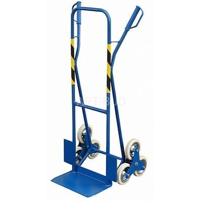 Specjalizowany stalowy wózek transportowy na dwóch potrójnych kołach, przystosowany do transportu towarów po stopniach schodowych. Wózek służy do transportu magazynowego ciężkich ładunków i pakunków standaryzowanych o regularnych kształtach i wymiarach takich jak paczki, kartony, pralki, lodówki, worki. Dodatkowo w celu poprawy ergonomii, wózek jest wyposażony w uchwyty wykończone nakładkami z tworzywa sztucznego z funkcją ochrony dłoni. Produkt zaopatrzony w wygodne koła pełne z jasnej niebrudzącej gumy o średnicy 160 mm. Dzięki zastosowanym łożyskom wałeczkowym wózek jest tańszy niż w wersji na łożyskach kulkowych, bez pogorszenia warunków pracy oraz czasu użytkowania. Całość pomalowana proszkowo w standardowym kolorze niebieskim RAL 5010. Produkt wykonany w Polsce, cechuje solidne wykonanie i gwarancja trwałości i odporności w dłuższym użytkowaniu. Znajduje zastosowanie zarówno w magazynach, warsztatach remontowych, zakładach produkcyjnych, pracach budowlanych itp.