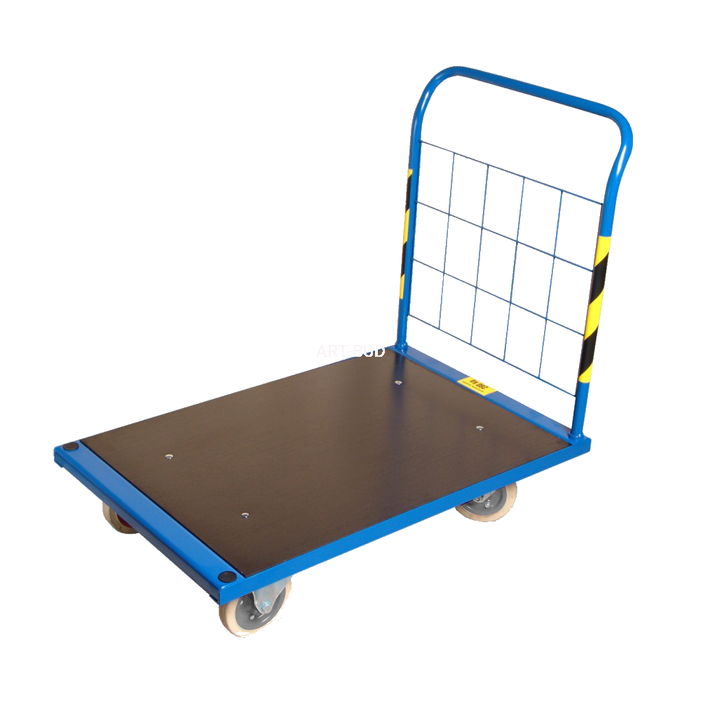Ma wzmocnioną przestrzeń ładunkowa wózka wypełnioną wodoodporną, antypoślizgową sklejką o grubości 12 mm. Trwała i mocna konstrukcja wózka została wykonana z wysokiej jakości stali co gwarantuje jego wytrzymałość i bezpieczeństwo użytkowania a wyposażenie w 4 pełne koła (szara niebrudząca guma) o średnicy 160 mm-2 stałe i 2 obrotowe- gwarantuje komfort pracy na równych powierzchniach, dużą zwrotność w małych pomieszczeniach oraz brak konieczności sprawdzania ciśnienia w oponach. W układzie jezdnym wózka zastosowaliśmy łożyska wałeczkowe, dzięki czemu użytkowanie jest w zasadzie bezobsługowe przez długi czas.
