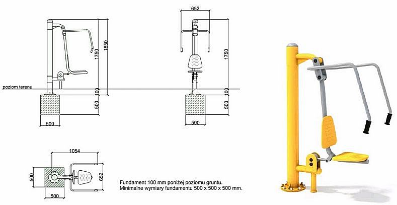 Montaż: mocowanie do fundamentu betonowych (wylewanych na miejscu), osadzonych 10 cm poniżej poziomu terenu. Daje to możliwość zastosowania pod urządzeniami różnego rodzaju nawierzchni np. trawiastej, różnego rodzaju nawierzchni bezpiecznej, z kostki brukowej itp.