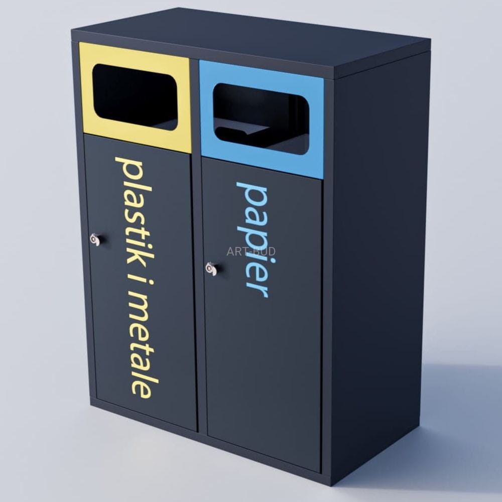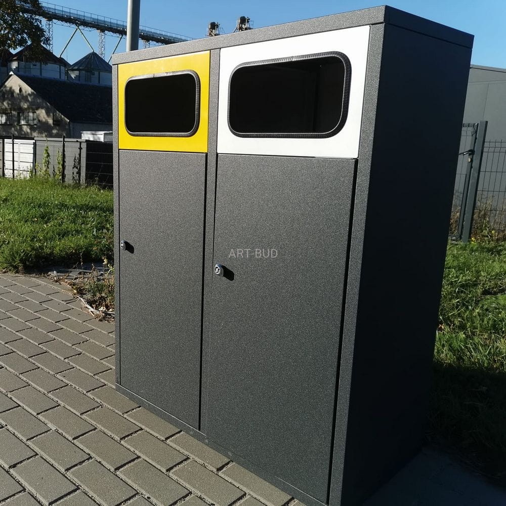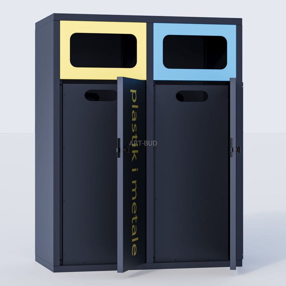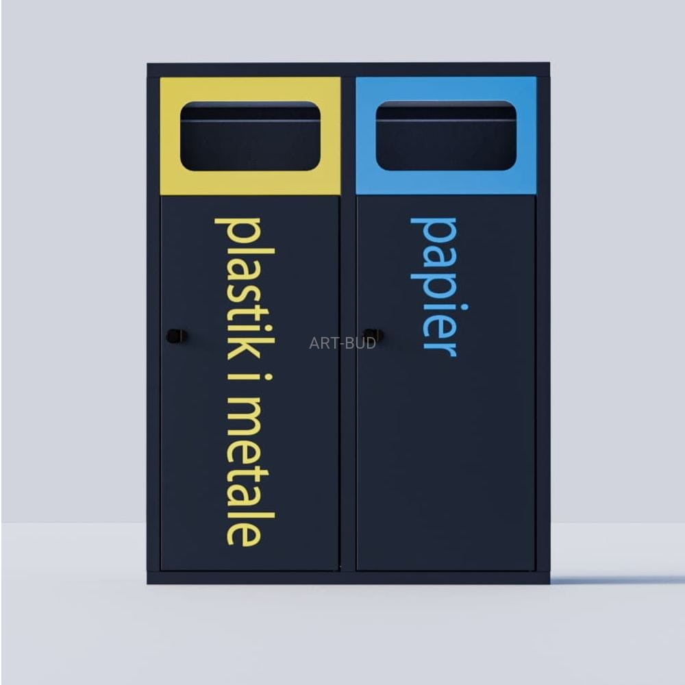 Nowoczesna zabudowa pojemników do segregacji odpadów. Posiada dwie zamykane komory na standardowe pojemniki 80 litrowe. Zabudowa o mocnej konstrukcji stalowej z blachy 1,25 mm ocynkowanej i malowanej w kolorze antracytowym