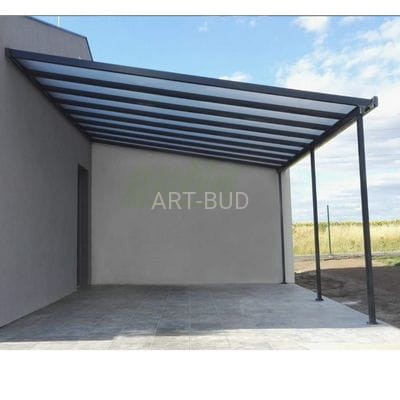 Zadaszenie tarasu, to kompletna konstrukcja z aluminium z wypełnieniem poliwęglanem komorowym do samodzielnego montażu. Zadaszenie w ekspozycji tarasowej, mocowane z jednej, wyższej strony do ściany domu a z drugiej, niższej wsparte na dwóch lub trzech narożnych słupach, podporach na powierzchni tarasu.
