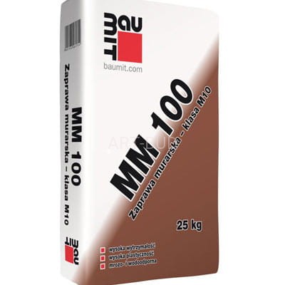 Baumit MM 100 fabrycznie przygotowana, sucha, cementowo–wapienna zaprawa o wytrzymałości >10 MPa, do murowania ścian nośnych przy użyciu wszystkich powszechnie stosowanych cegieł i bloczków budowlanych.