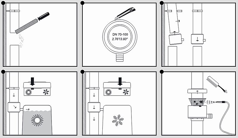 Zbieracz wody deszczowej z rur spustowych pionowych do pojemników użytkowych i dekoracyjnych. Zbieracz wody deszczowej jest umieszczony w rurach odpływowych o wymiarach DN 70 do DN 100. Końcówka wyjściowa 1'.