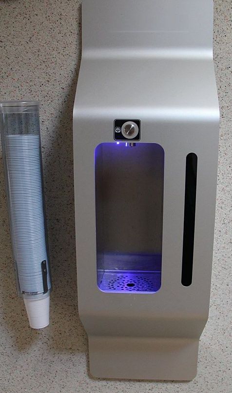 kubków wodą wodociągową. Rewolucyjna stylistyka i nadzwyczajna uniwersalność umożliwiają zamontowanie urządzenia praktycznie w każdym miejscu. Wykonane całkowicie ze stali nierdzewnej i aluminium, z jednym przyciskiem sterującym ze stali nierdzewnej. Eleganckie i praktyczne rozwiązanie dla budynków biurowych, wodociągów, domów mieszkalnych, rezydencji, wysokiej klasy apartamentowców i hoteli. Doskonałe dla sal obsługi klienta, szkół, szpitali i wszystkich tych miejsc, gdzie ze względów bezpieczeństwa nie można zastosować urządzenia stojącego na podłodze. Opcjonalnie dostępna lampa UV na wyjściu. Wymiary D*S*W 263*114*900 mm, waga 15 kg, 1 przycisk sterujący, wysokość przestrzeni dozowania 290 mm. W zestawie z chłodziarką i butlą CO2 urządzenie podaje chłodzoną wodę gazowaną - WALL-2, cena na zapytanie.