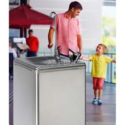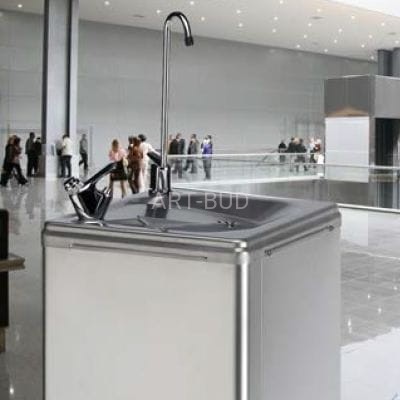 Urządzenie postumentowe wykonane ze stali nierdzewnej, wyposażone w wbudowana wylewkę, niezawodny zawór samozamykający oraz kranik do napełniania butelek, bidonów, kubków i karafek z automatycznym zamknięciem wody. Zapewnia dostęp do wody pitnej z sieci wodociągowej. Jednolita płyta wierzchnia z misą ze stali nierdzewnej stanowi elegancki i łatwy w utrzymaniu element urządzenia. Urządzenie idealne do szkół, biur, galerii handlowych, urzędów, placówek medycznych, obiektów sportowych itp. Posiada atest PZH.