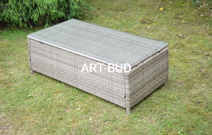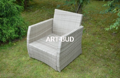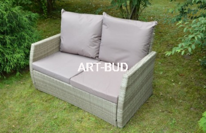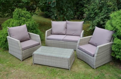 Meble pokryte są sztucznym rattanem w kolorze szaro-brązowym. Struktura rattanu jest nieregularna co dodaje zestawowi dodatkowego uroku. Każdy z elementów zestawu stoi na małych nóżkach.