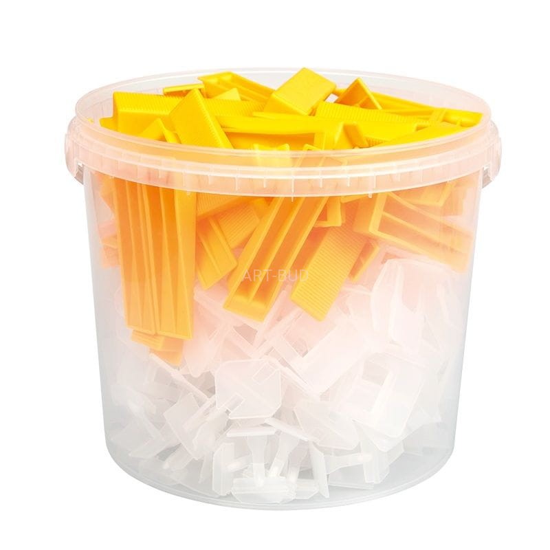 Zestaw do poziomowania płytek uniemożliwiający ich przesuwanie się podczas wysychania kleju. Zalecany szczególnie przy układaniu płytek o dużych formatach. Zestaw składa się z 300 szt. klipsów dostosowanych do szerokości fugi 2 mm i 100 klinów. Klipsy i kliny zostały umieszczone w praktycznym wiaderku.