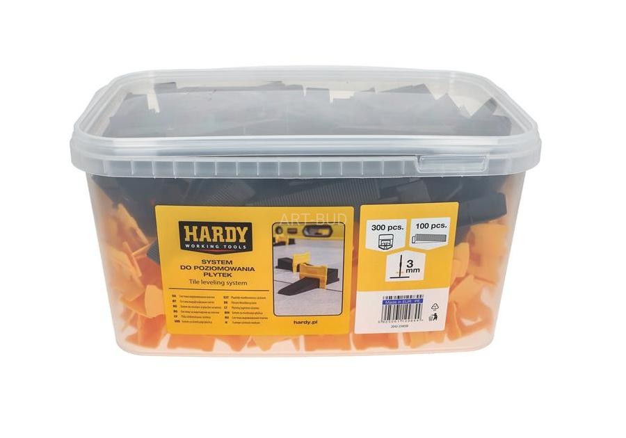 System poziomowania płytek Hardy to niezastąpione narzędzie dla każdego glazurnika, niezależnie od poziomu doświadczenia.W skład zestawu wchodzą klipsy oraz kliny, które gwarantują nie tylko łatwość użycia, ale przede wszystkim doskonały efekt końcowy. Dzięki zastosowaniu wysokiej jakości materiałów, system Hardy zapewnia perfekcyjne wykończenie, eliminując wszelkie nierówności. Klipsy pozwalają utrzymać stałą grubość fugi a łatwo usuwalne kliny gwarantują szybki montaż i demontaż.