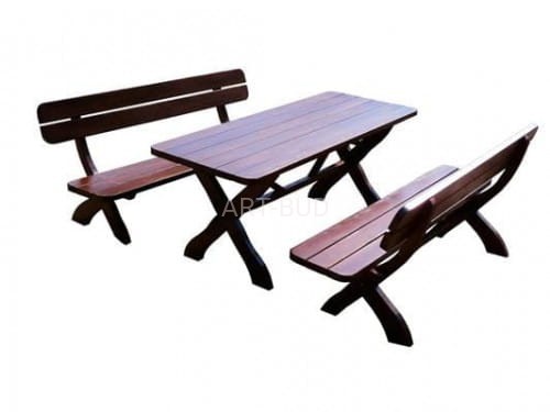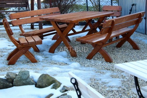 Przedstawiona cena dotyczy zestawu składającego się z 2 ławek i stołu, z impregnacją i lakierowaniem.