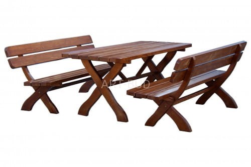 Zestaw mebli bawarskich posiada grube elementy konstrukcyjne są gwarancją trwałości a wyprofilowane siedziska na ławkach i krzesłach sprawiają że siedzenie jest bardzo komfortowe. Wszystkie kanty w zestawie mebli bawarskich są zaokrąglone, zestaw jest bardzo bezpieczny i wygodny do siedzenia na końcu ławki.