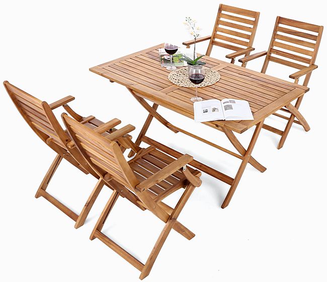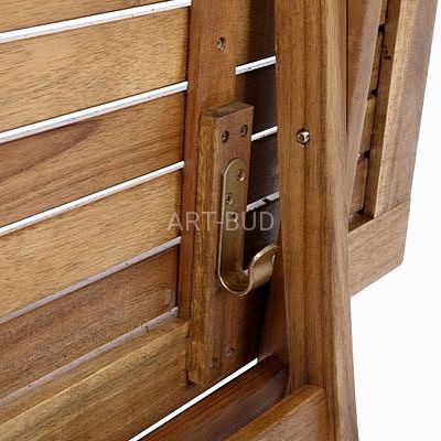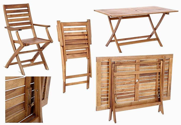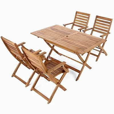 Piękny zestaw mebli ogrodowych z twardego drewna egzotycznej akacji, drewna niezwykle twardego, odpornego na urazy mechaniczne, warunki atmosferyczne a jednocześnie posiadającego ciekawą fakturę i zróżnicowaną kolorystykę. Drewno akacjowe odpowiednio konserwowane i przechowywane, może służyć kilkanaście lat. Cały ten zestaw, prawdziwie "kolonialny" składa się ze stołu i 4 krzeseł. Wszystkie części zestawu łącznie ze stołem, są składane, co bardzo ułatwia ich przechowywanie. Pośrodku stołowego blatu znajduje się otwór na parasol ogrodowy.