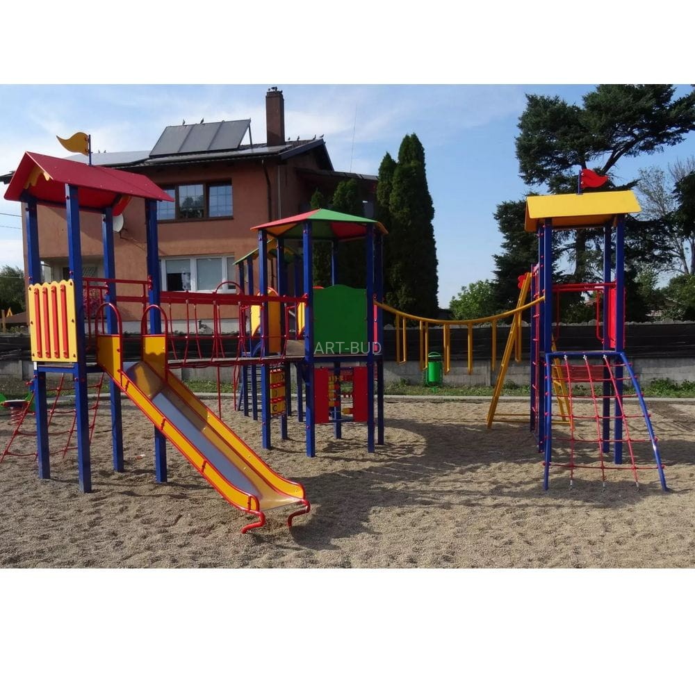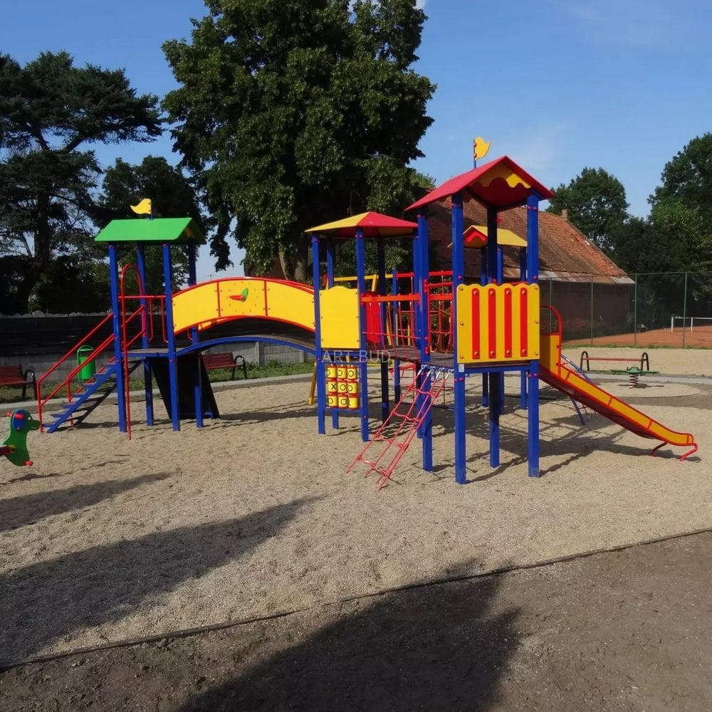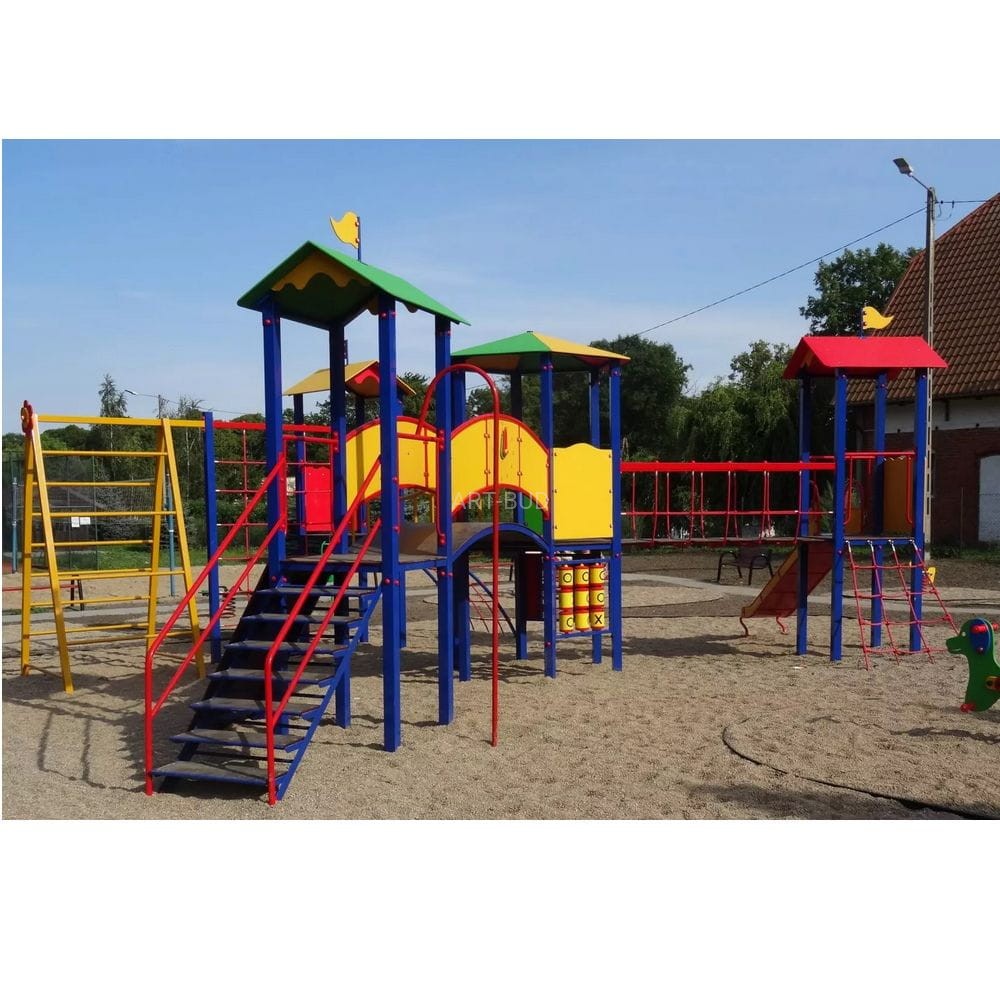 Duży zestaw na place zabaw o wymiarach 7x9 m z szeregiem klasycznych elementów stanowiacych spójny kompleks zabawowy dla dużej grupy najmłodszych.