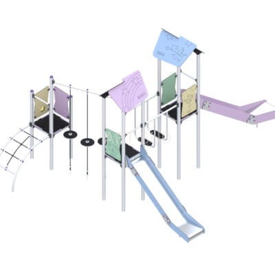 Bardzo ciekawy zestaw zabawowy rozwijający wiele różnorodnych zdolności i sprawności dedykowany na Place Zabaw. Na stosunkowo małej powierzchni zestawiono wiele elementów zabawowych w tym dwie zjeżdżalnie. Zestaw posiada wiele funkcji do rozwijania sprawności fizycznej i umysłowej. Charakteryzuje się najwyższą jakością i poziomem wykończenia a jednocześnie dbałością o zapewnienie maksymalnego bezpieczeństwa. Renomowany polski producent gwarantuje stosowne certyfikaty na swoje urządzenia, polskie i europejskie. Urządzenie zgodne z normą PN-EN 1176.