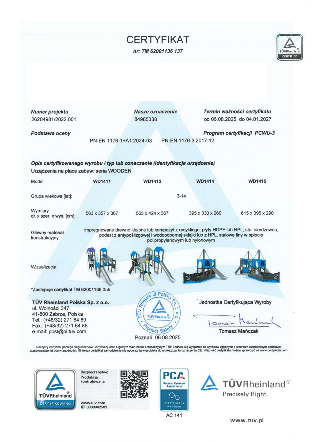 Wszystkie urządzenia posiadają certyfikaty zgodności z normą PN EN 1176 z TUV Rheinland, COBRABiD-BBC.