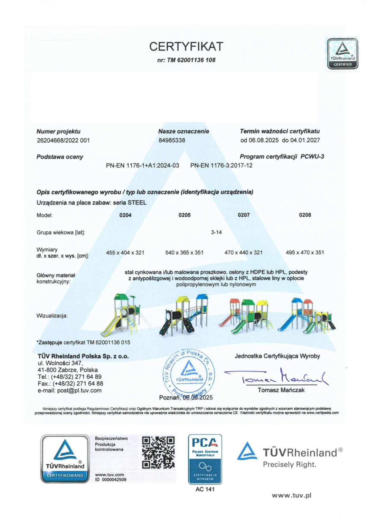 Stalowa konstrukcja czyni plac zabaw wysoce wytrzymałym i co najważniejsze bezpiecznym dla ich użytkowników. Rama stalowa ocynkowana, malowana proszkowo oraz zjeżdżalnia wykonana ze stali nierdzewnej są gwarantem wieloletności oraz odporności na zmieniające się warunki atmosferyczne. Ponadto do zwiększenia bezpieczeństwa przyczynia się antypoślizgowa i wodoodporna płyta podłogowa.