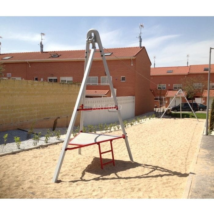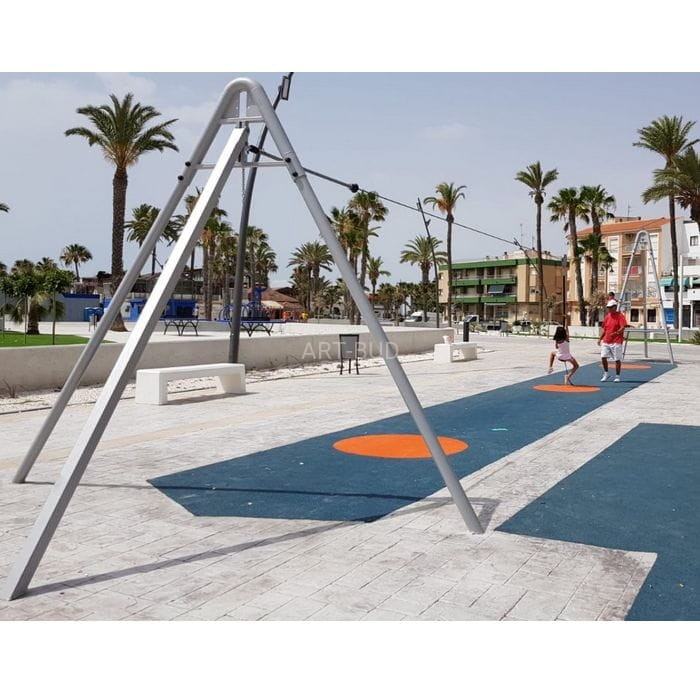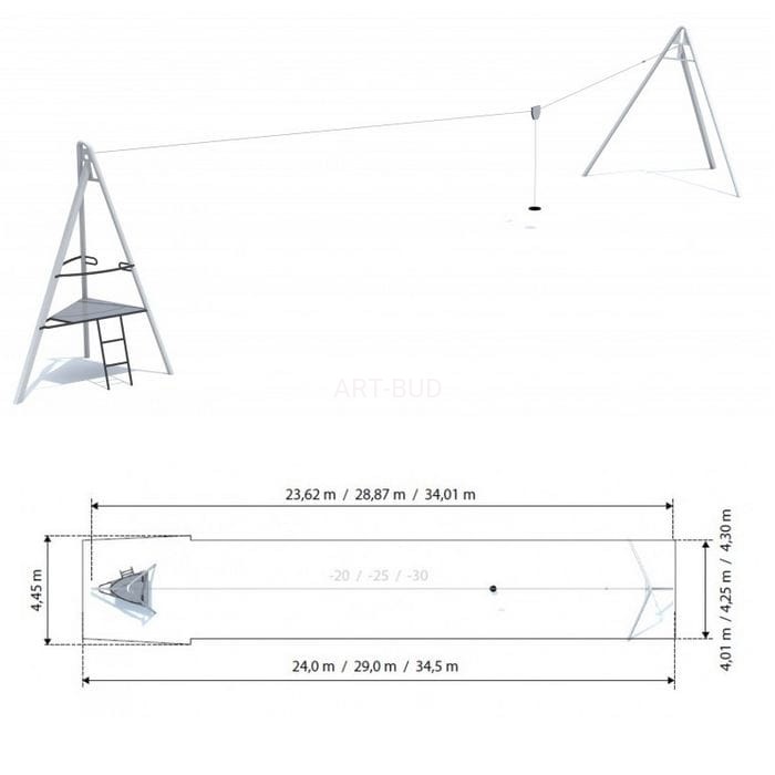 Zabawka typu zjazd na linie z liną rozciągniętą między dwoma stalowymi wieżami oraz ruchomym orczykiem o długości 20 m. Urządzenie o kolorze konstrukcji grafitowym i szarym oraz z kolorem siedziska czarnym.