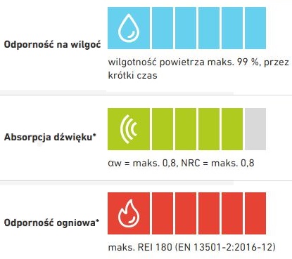 - Izolacja akustyczna (CAC): do 35 dB - ogranicza przenikanie dźwięków między pomieszczeniami