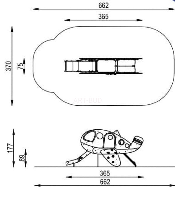 Urządzenie w formie samolotu to atrakcyjny element wyposażenia placu zabaw, który łączy funkcję zabawy tematycznej z aktywnością fizyczną. Motyw lotniczy pobudza wyobraźnię dzieci i zachęca do kreatywnej zabawy w odgrywanie ról.