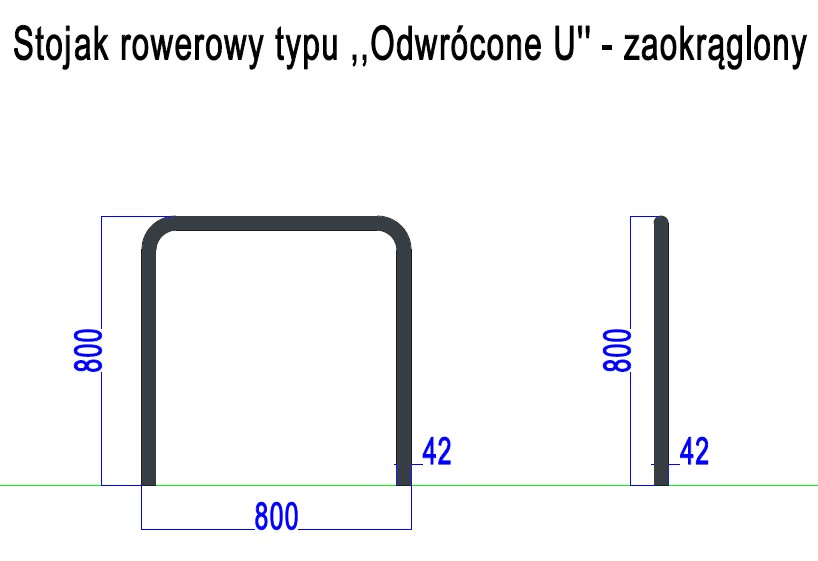 Konstrukcja wykonana jest ze stali, zabezpieczonej podkładem cynkowym oraz malowaniem proszkowym, co zapewnia trwałość i odporność na warunki atmosferyczne. Stojak dostępny jest w dowolnym kolorze z palety RAL, dzięki czemu można dopasować go do otoczenia. Przy jednym stojaku mogą stać 2 rowery.