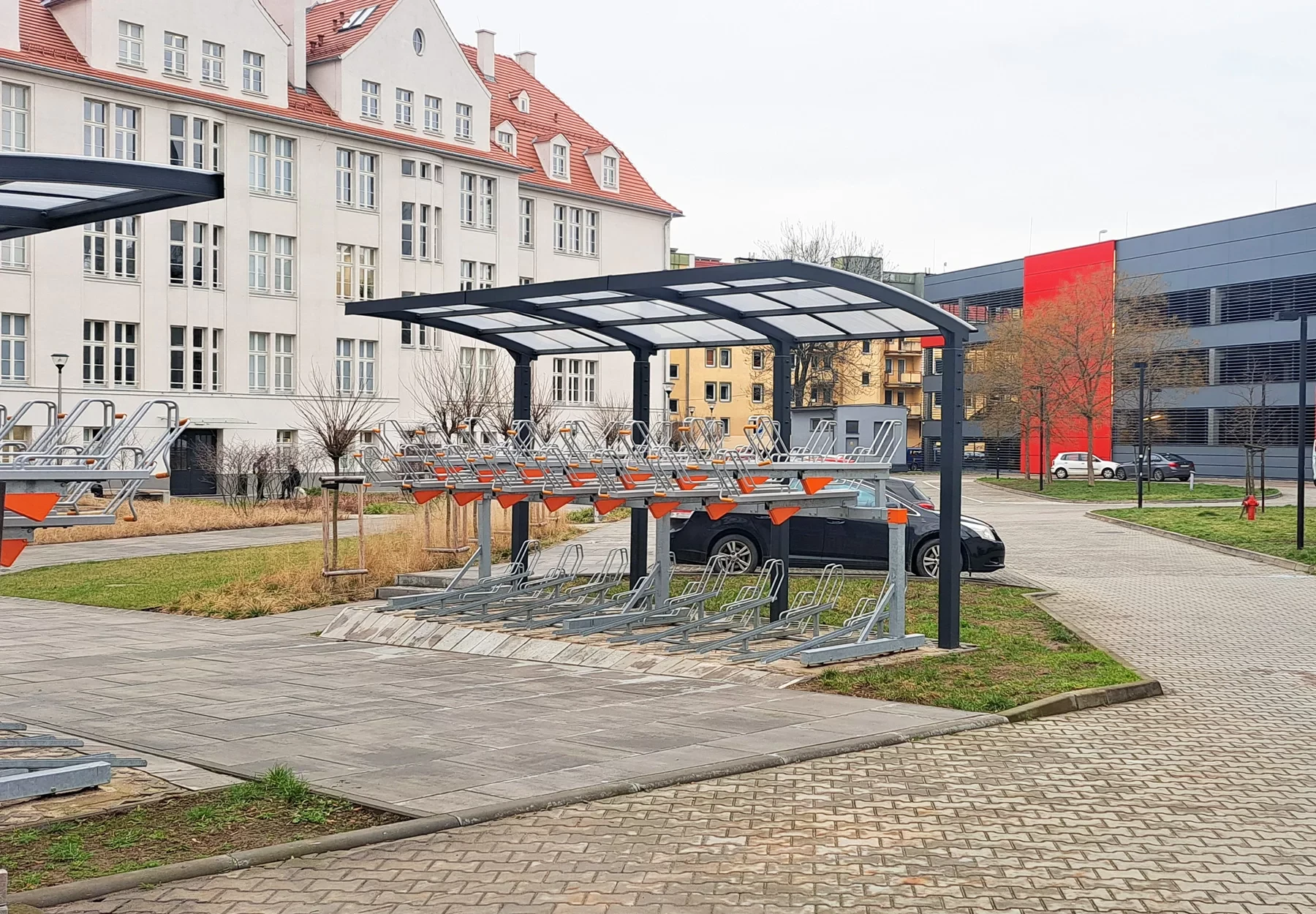 Modułowa konstrukcja pozwala na elastyczne dopasowanie liczby miejsc postojowych do dostępnej przestrzeni, zarówno w formie wolnostojącej, jak i rozbudowanych ciągów parkingowych.