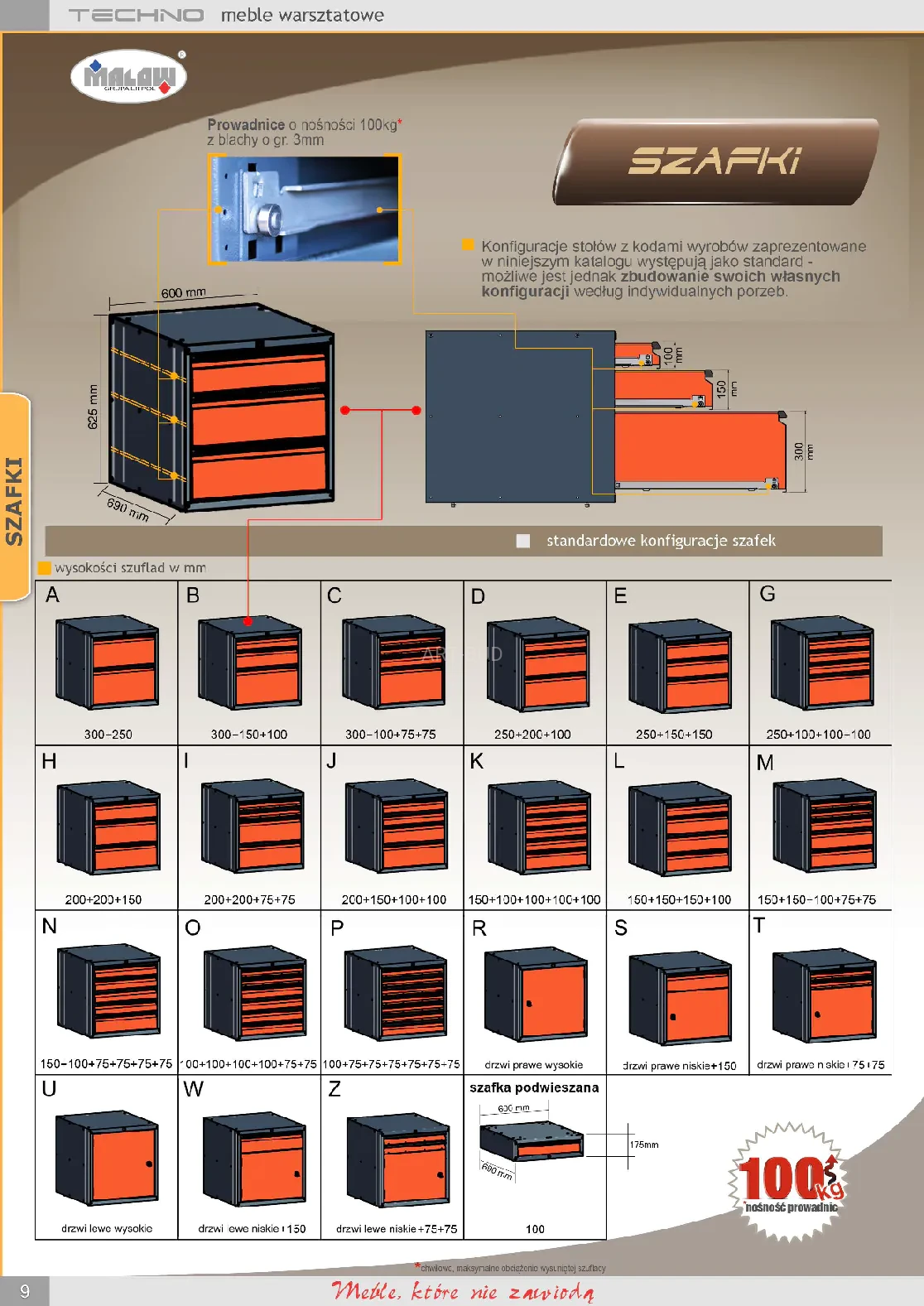 - Prowadnice szuflad: nośność 100 kg, aluminiowe uchwyty z miejscem na kartę opisową